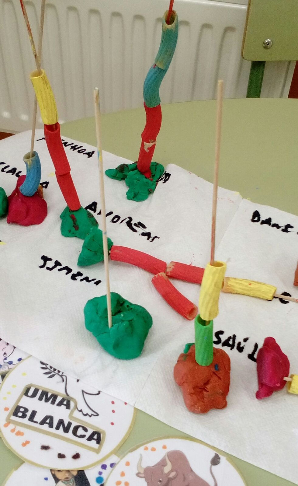 También trabajamos nuestros collares hechos con macarrones que pintaron ellos y con el cartelito de su nombre.
